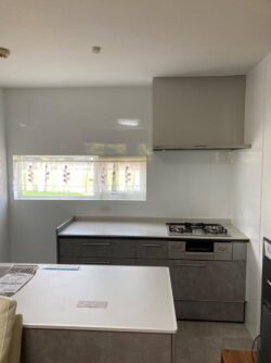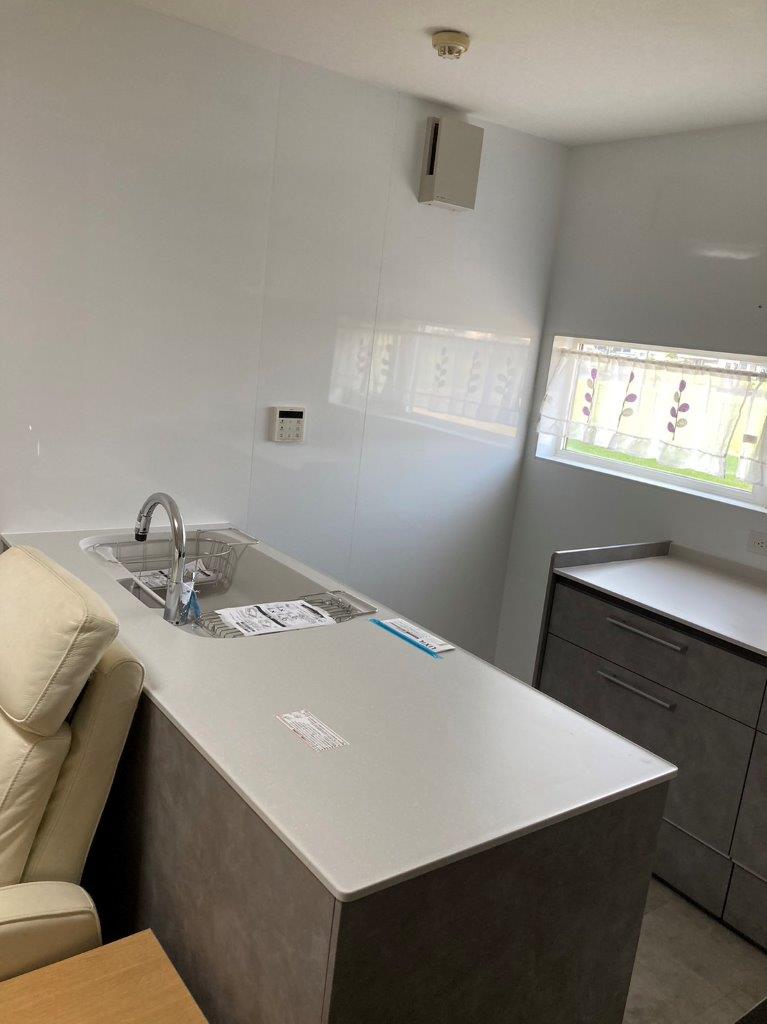 FPの家のリフォームが完成しました! わんちゃんのために、床はCFで施工しています。 I型の壁付けのキッチンから、片側だけ壁につけた二列配置のペニンシュラキッチンです。 壁のキッチンパネルは、マグネットがつくものにしました。